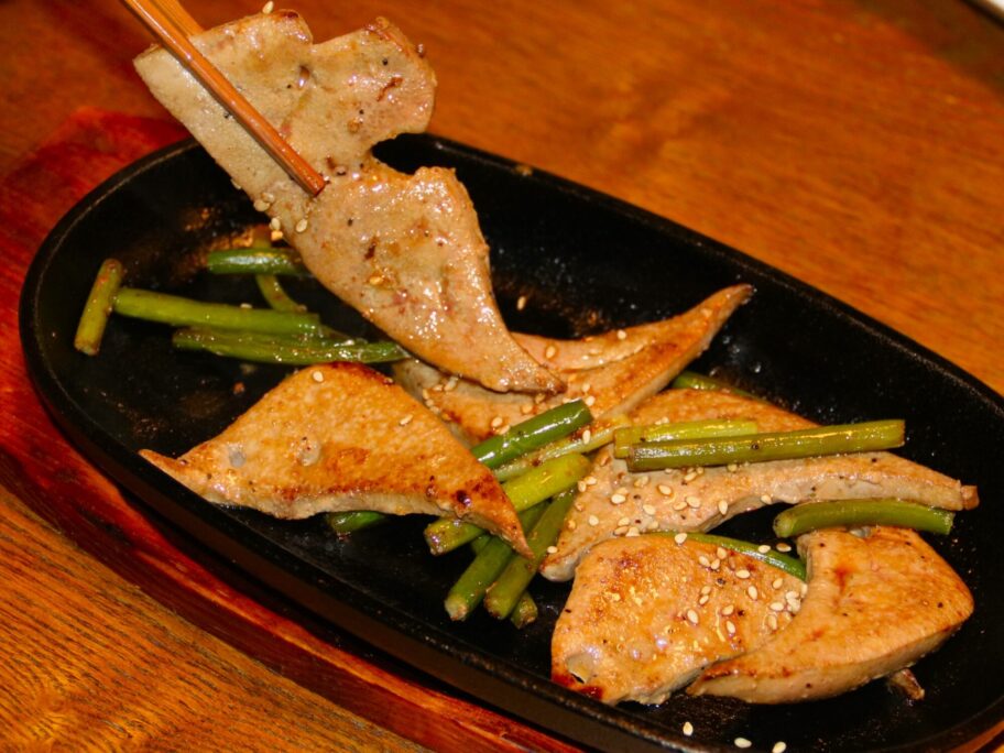1番手はレバー。新鮮なのが入る日しか出ません。大ぶりなカットです。臭みはまったくなく、レモンダレに付けると、さらにさっぱり。