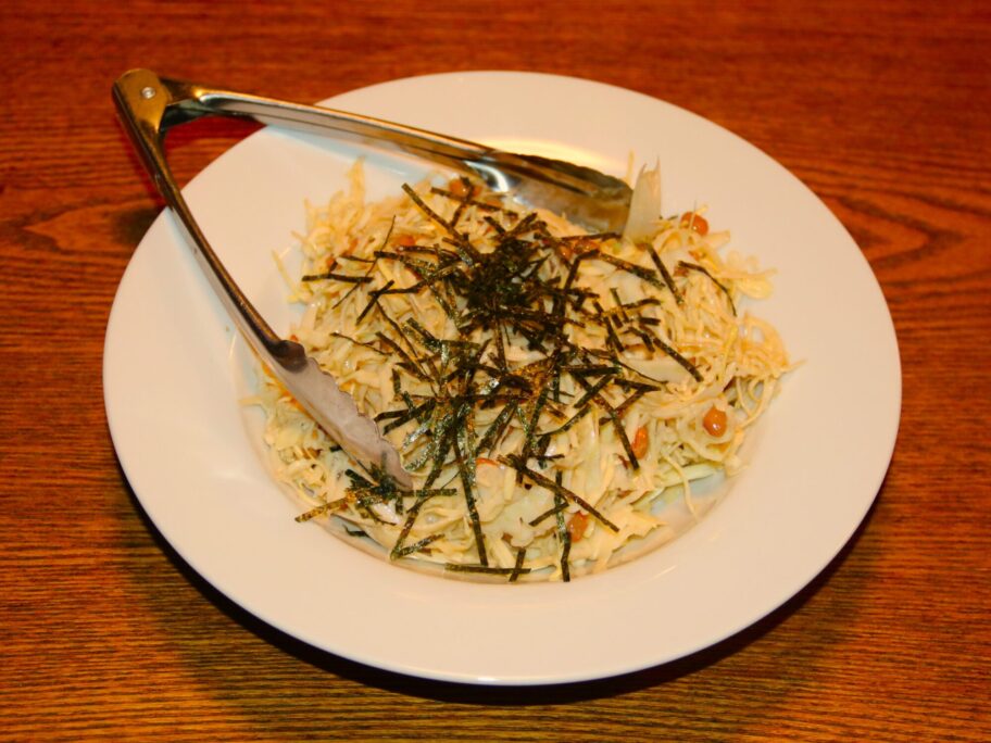 と、その前に。気になった「やみつき納豆サラダ」と愛想のいい店員さんが薦める「丸ごと玉ねぎスープ」で野菜を摂取しておきます。