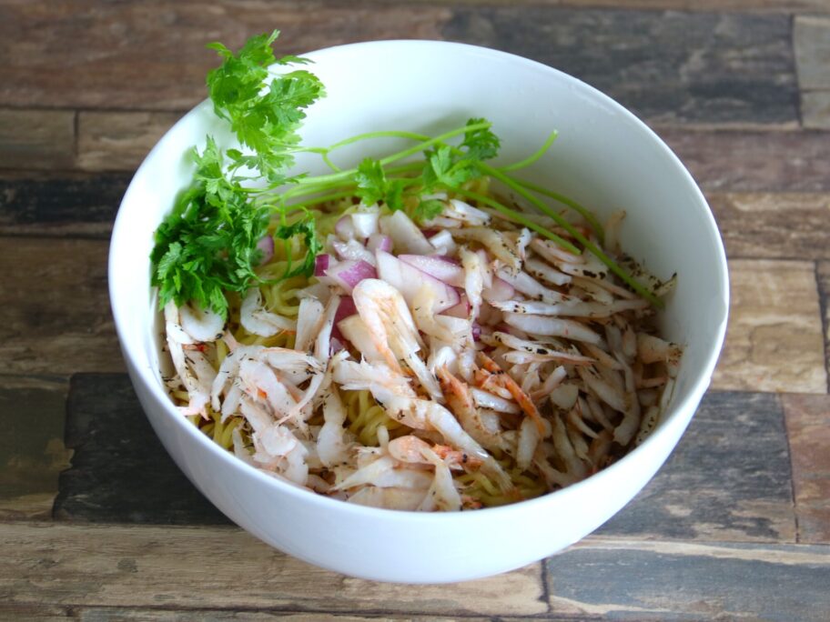 和え玉の具は釜揚げ白海老でした。丼の底にある醤油ダレとよく和えていただきます。