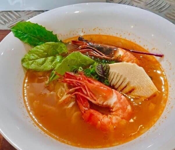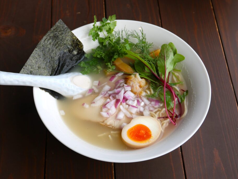 塩は地鶏のスープにイリコ、昆布、鰹節、鯖節を合わせて深みを出しています。ハーブ系の野菜が多く、サラダ感覚でいただけますね。