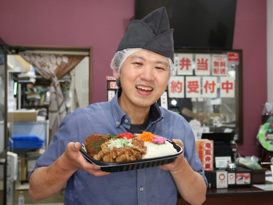 ▲自慢の「1㌔以上弁当」を手にする山本さん