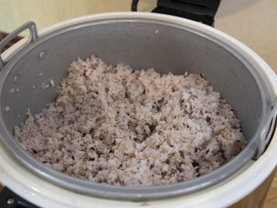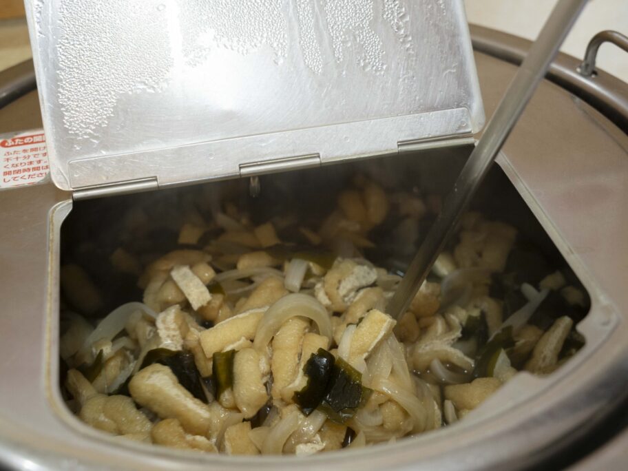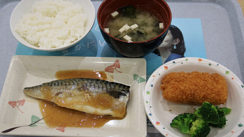 ご飯は白飯と五穀米、汁物は味噌汁とスープです。白飯をマンガ盛りにする男子、五穀米を少しだけの女子。好きな量を選べるのはいいですね。