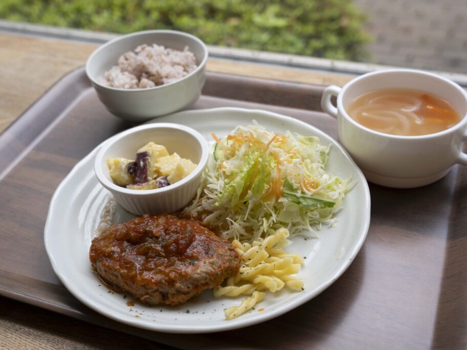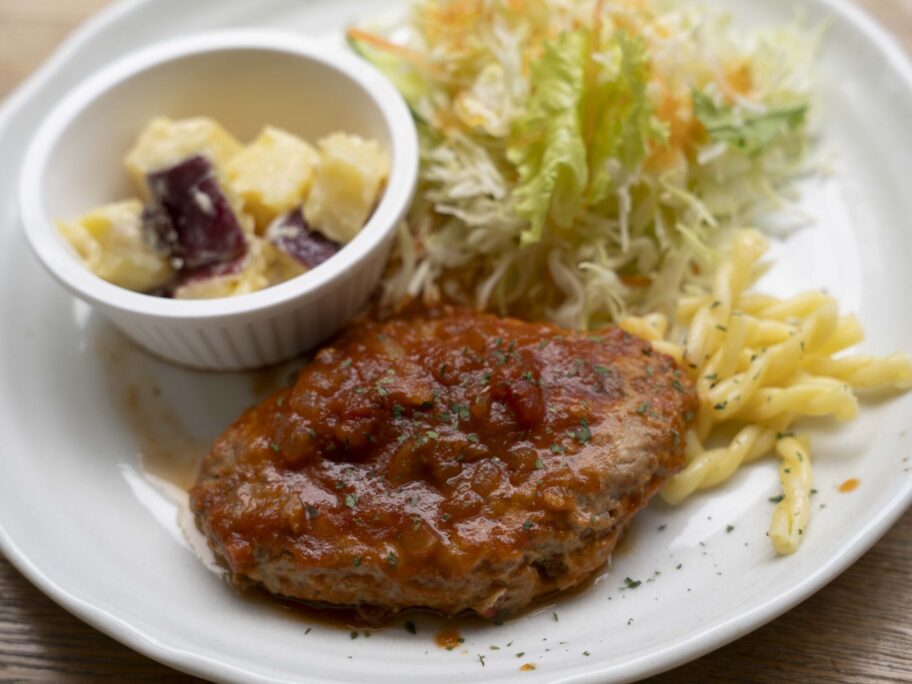 ハンバーグは手作り感が満載です。肉汁があふれる、といった豪華版ではありませんが、粗挽きの肉はジューシー。トマトソースも酸味が効いて、肉をさっぱりとさせてくれます。