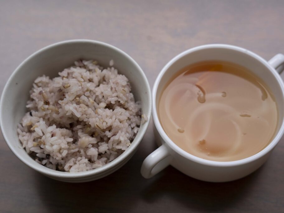 健康に留意して五穀米を七分程度よそいました。スープはたっぷりと。ニンジン、タマネギにコーンが入ったコンソメ。いいお味です。