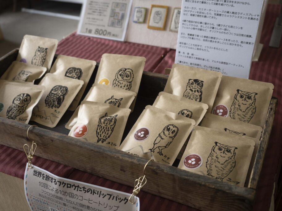 木製品やマグネット、コーヒードリップパックなど、ふくろうにちなんだグッズもそろっています。