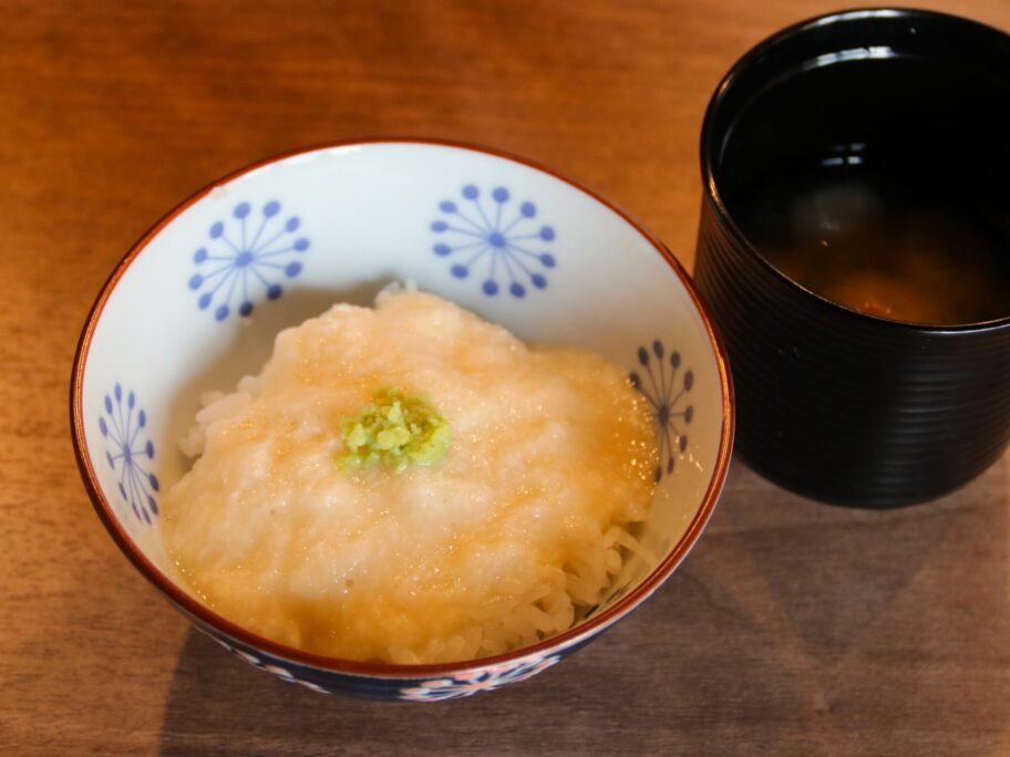 ごはんにとろろを掛けてワサビを乗せてみました。とろろは味噌と出汁で味が付けたそうです。これまた、しみじみ旨い。お替りしたいな。