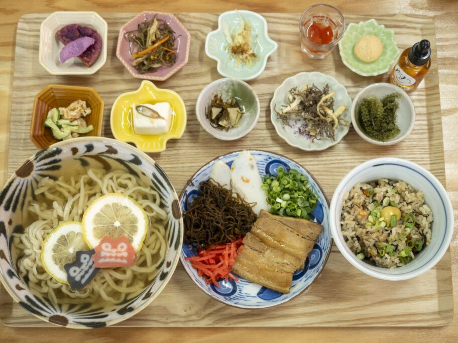 沖縄そばのセットが凄すぎ。Aは炊き込みご飯のじゅーしーめ、Bはおにポーとのセットで、沖縄料理の小鉢が10品付いてきます。無理言って、冷やし沖縄そばのAセットにしてもらいました。