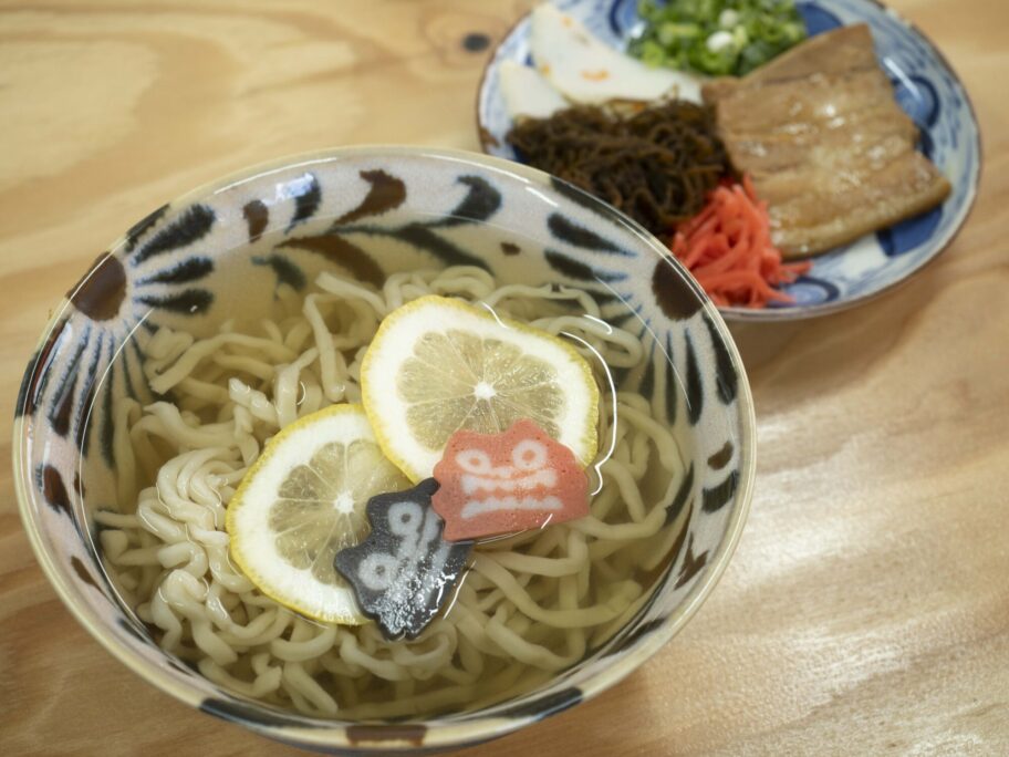 冷やし沖縄そばは具材が別皿で提供されます。まずは具を入れず、純粋にそばを堪能しましょう。