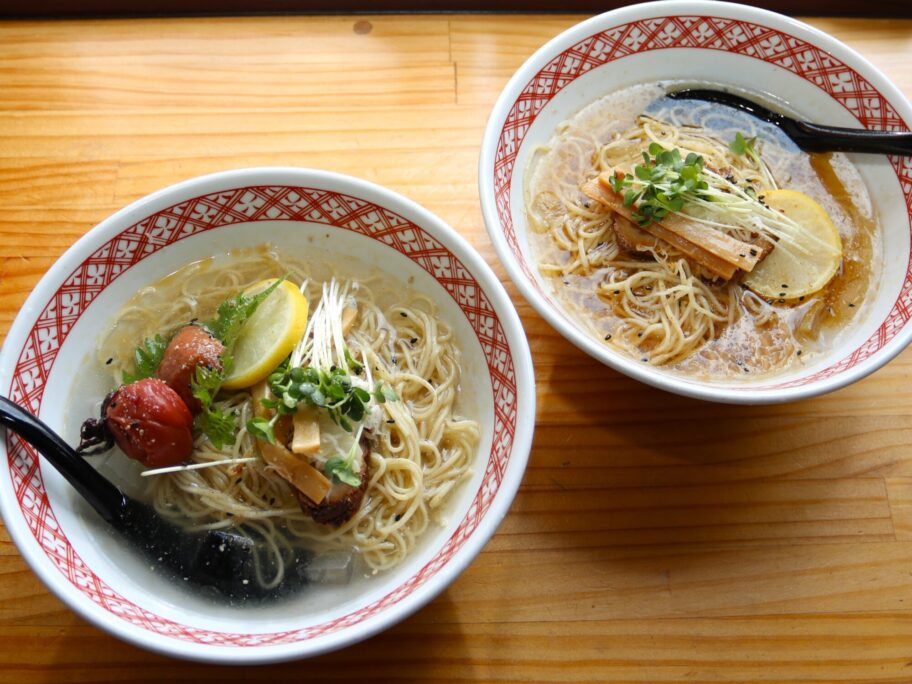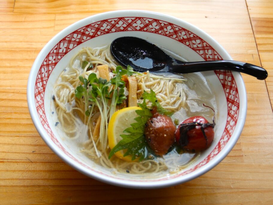 梅が苦手の人は冷やしラーメンをどうぞ。醤油味と塩味があります。梅がないだけで内容は同じ。レモンを絞ってさっぱりいただけます。