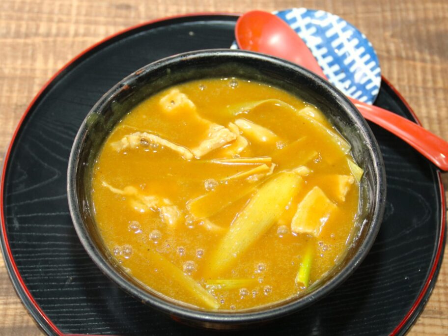 具は豚肉と長ネギ。群馬県産もち豚のバラは肉汁と同じく厚切り。カレーに負けていません。