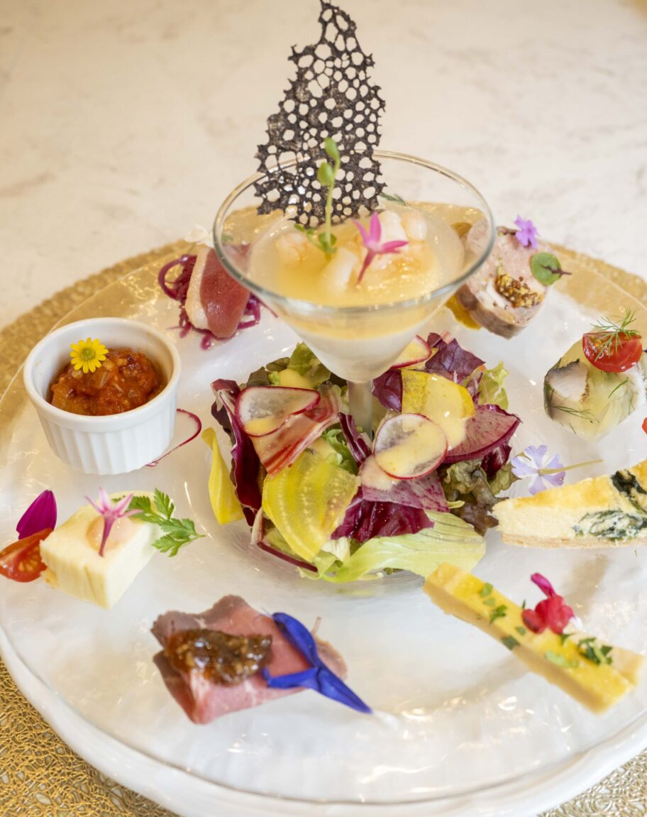 わー、デコレーションケーキみたい。丸いガラスの器に11種類の前菜が乗っています。