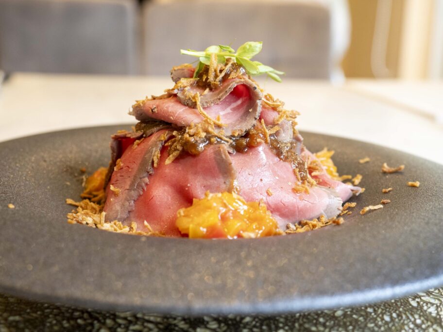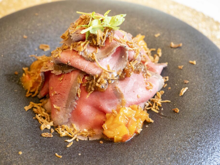 上からはフライドオニオンが散りばめられ、所々に、パプリカのラタトウユが盛り付けられています。