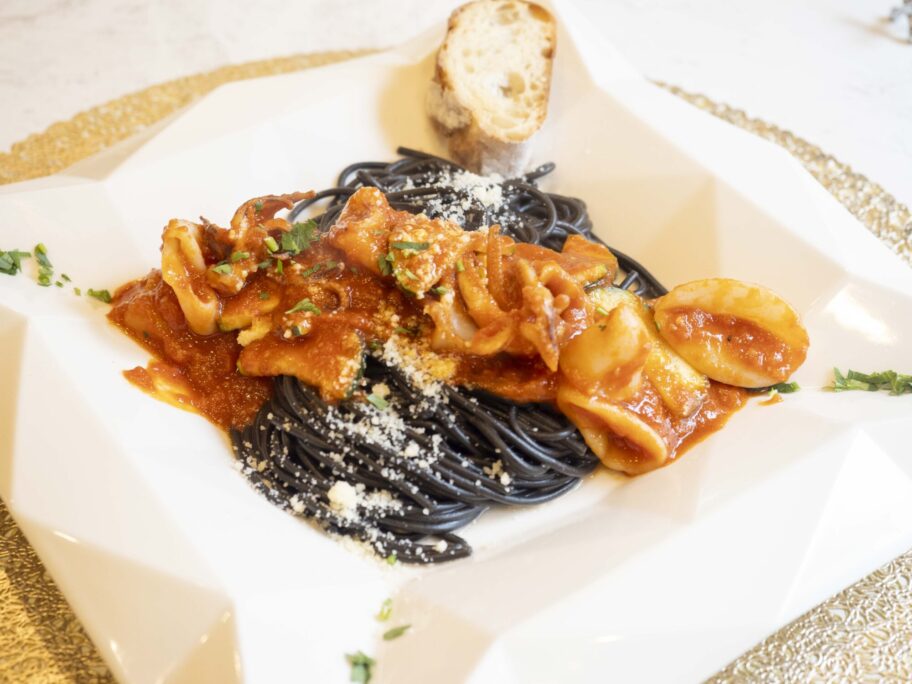 アルデンテの黒い麺にピリ辛味のトマトソースがとろりとかかっています。