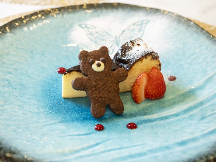 〆にいただいたデザートも美しくておいしかった。まろやかなバスクチーズケーキにクマちゃんクッキー付き。お皿には粉砂糖でアゲハ蝶。