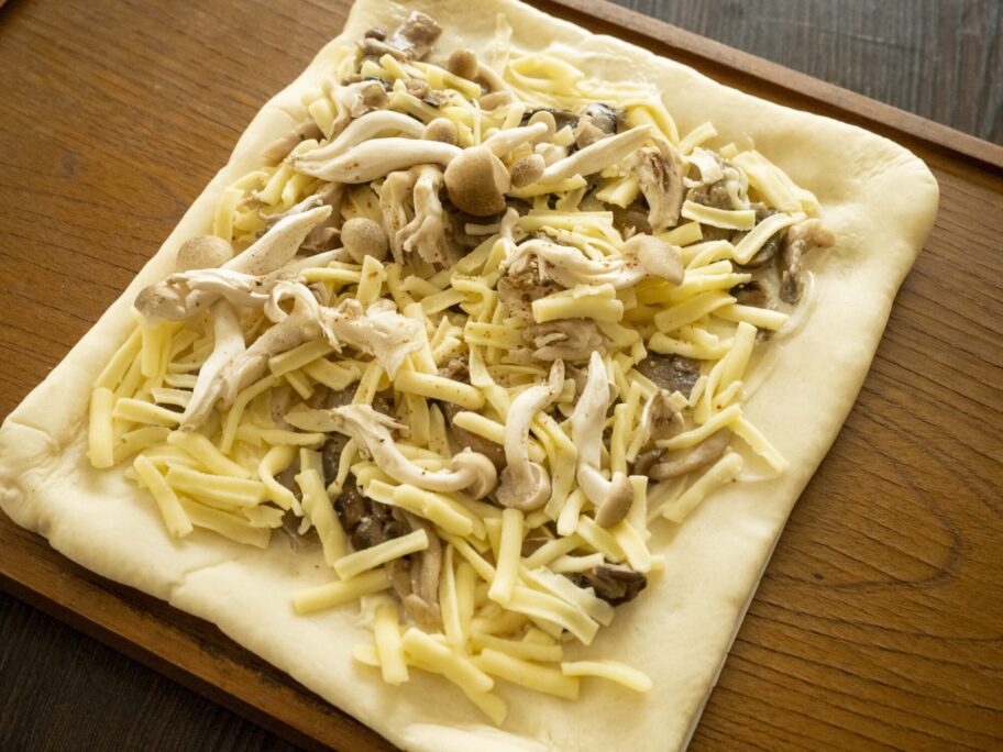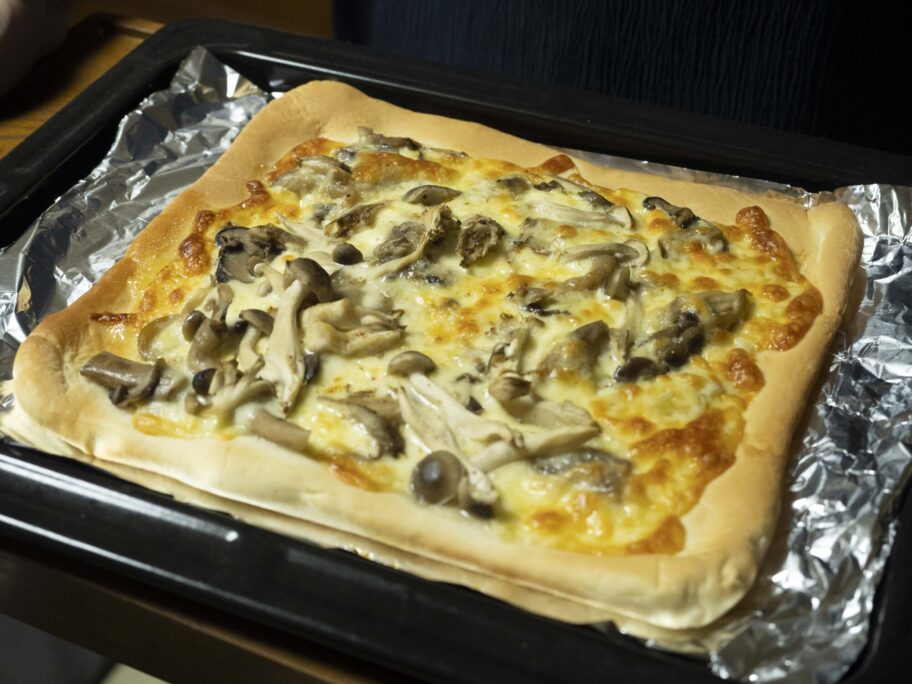 パン生地のキノコピザは、チーズが溶けて、生地がうっすらキツネ色になったら焼き上がり。さあ、いただきます。