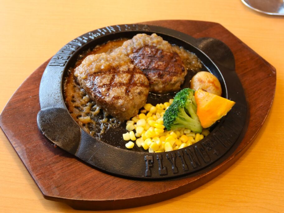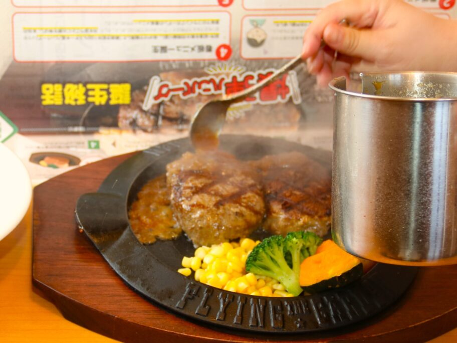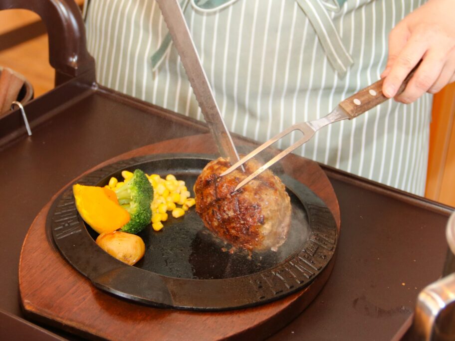 ジュージューと音を立てて、ワゴンがやってきました。表面がカリッと焼き上げられた俵型のハンバーグ。スタッフが慣れた手さばきで半分に切り分け、熱々の鉄板にレア状の中身を押し付けます。ソースを掛けると、ソースや肉汁が飛び跳ねるので、紙ナプキンでガードします。