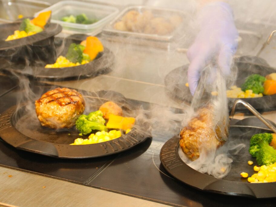 ▲熱したステーキ皿にハンバーグを置きます