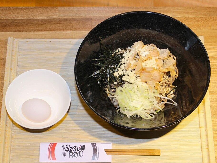 出来上がると食券の番号を呼ばれ、配膳口へ取りに行きます。この際、生卵を1個、サービスしてくれます。揚げ玉もセルフで好みの分を盛ります。
