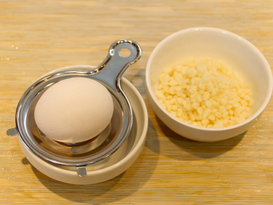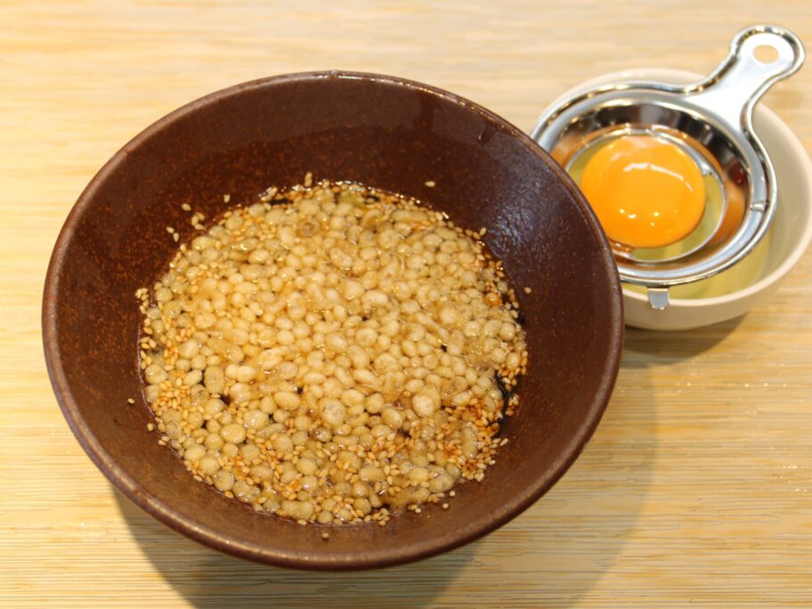 揚げ玉を入れてコクを加え、さらにセパレーターを使って卵黄のみ汁に投入します。ジャンクっぽくなってきます。これぞ、湊屋の醍醐味。