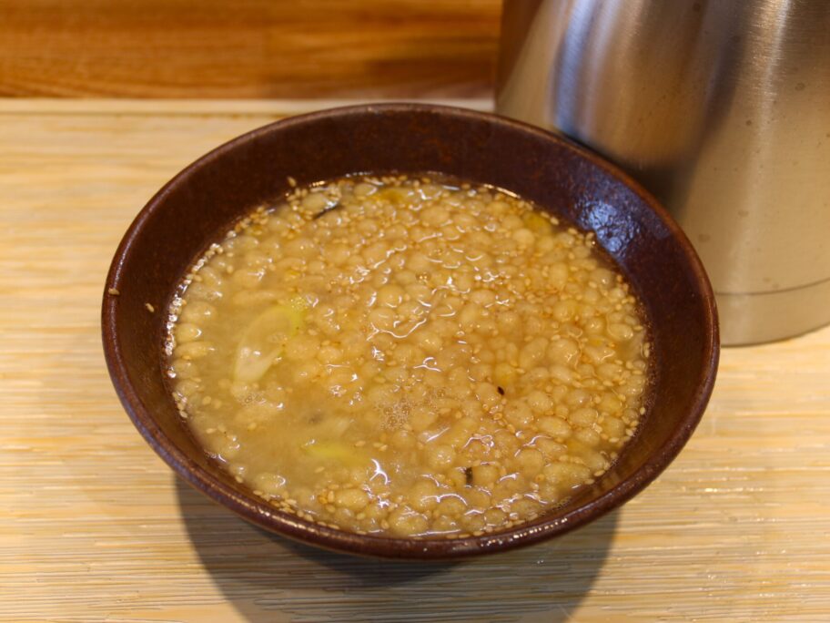 蕎麦を食べ終わったら白身を入れ、熱々の蕎麦湯をなみなみ注ぎます。卵スープの出来上がり。最後の一滴まで美味しく飲み干しました。