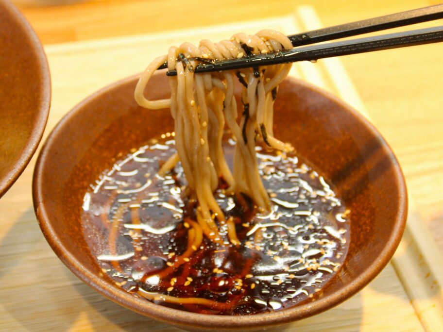 具に隠れている麺を取り出し、蕎麦の味を確認しましょう。太めで黒ずんだ田舎風。コシの強さは相当です。ラー油入りの汁に負けていません。