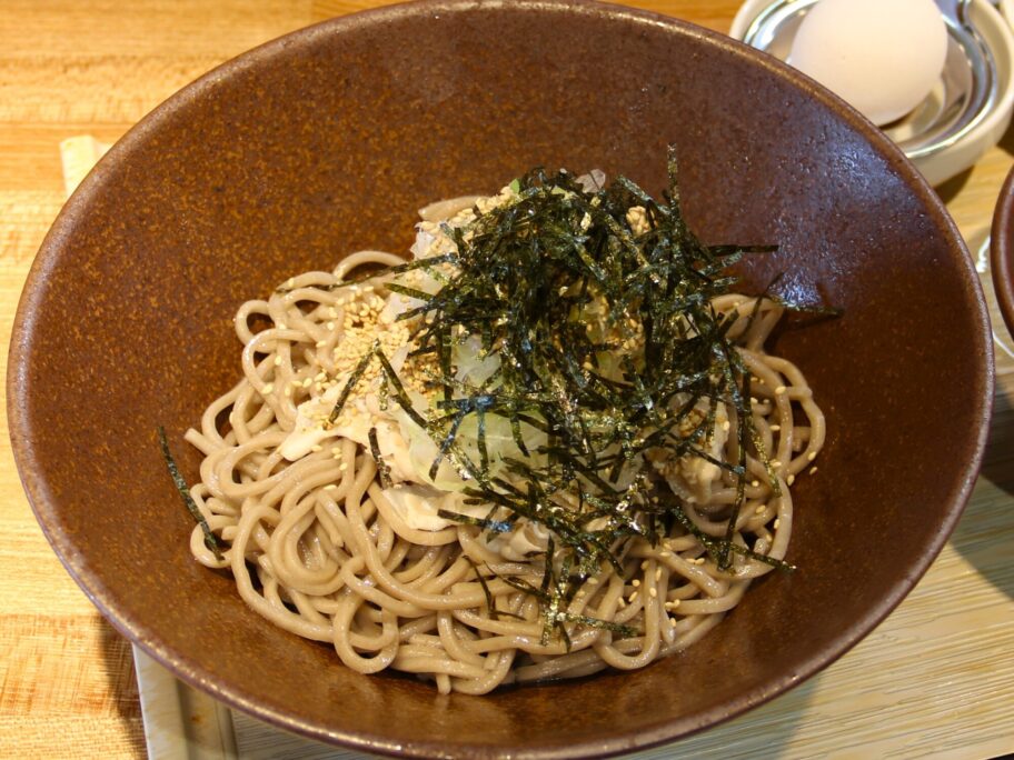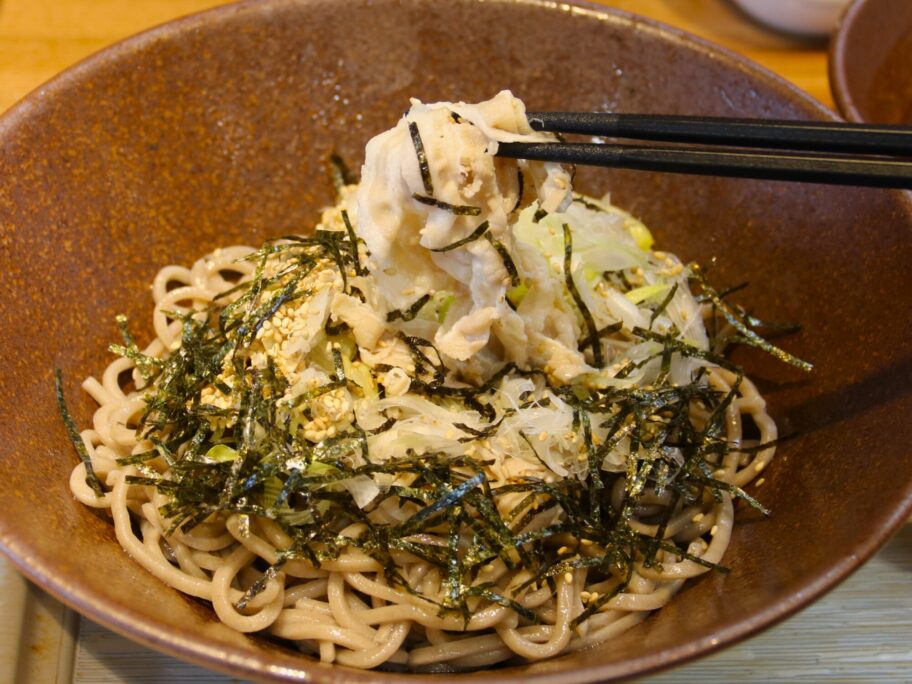 新橋にあった伝説の立ち食い蕎麦「湊屋」のインスパイア店です。黒く太い蕎麦の上に茹でた豚バラ肉とさらしネギ、刻み海苔、ゴマがたっぷり。ラー油入りの冷たい蕎麦汁に付けて啜ります。
