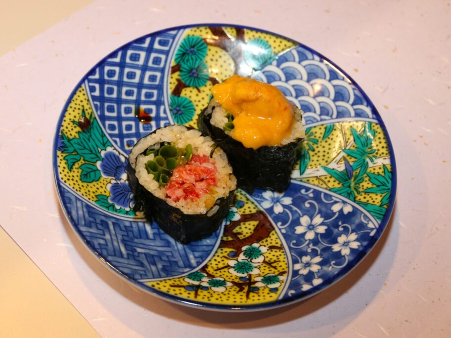 サーロインはネギトロ巻きに。上に生ウニを乗せる豪華さに目も舌もやられます。