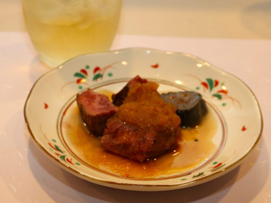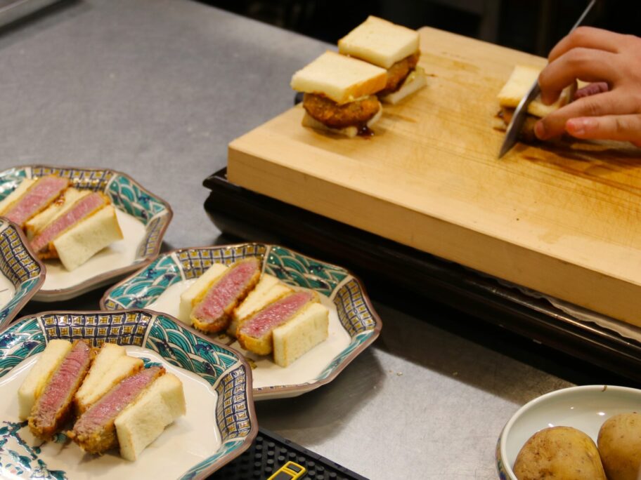お次は揚げ物。何と、シャトーブリアンでトンカツを作り出しました。トーストした食パンに挟んでカツサンドに。最高級のヒレの中心部にある超希少部位。レアで揚げたカツは本当にとろけそう。