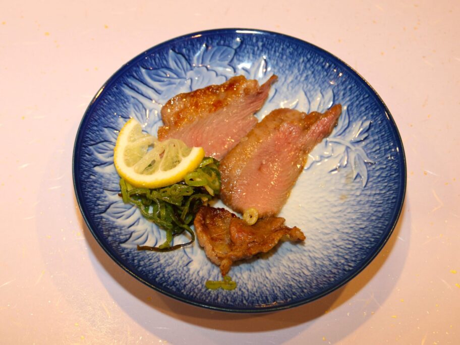ここで焼き物がきます。直前に切り分けた黒タンを分厚く切って炭火焼きに。九条葱と塩昆布の味付けがタンの旨みを引き出します。