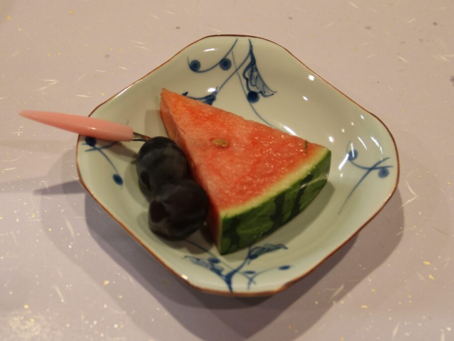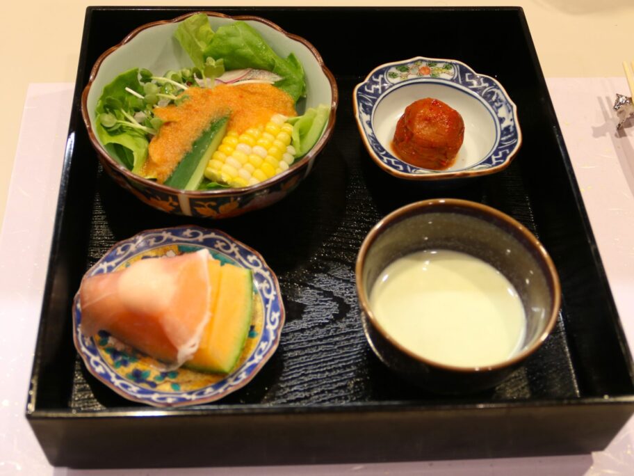 ▲前菜は生ハムクリームメロン、サラダ、南高梅のキムチに枝豆の冷製すり流し
