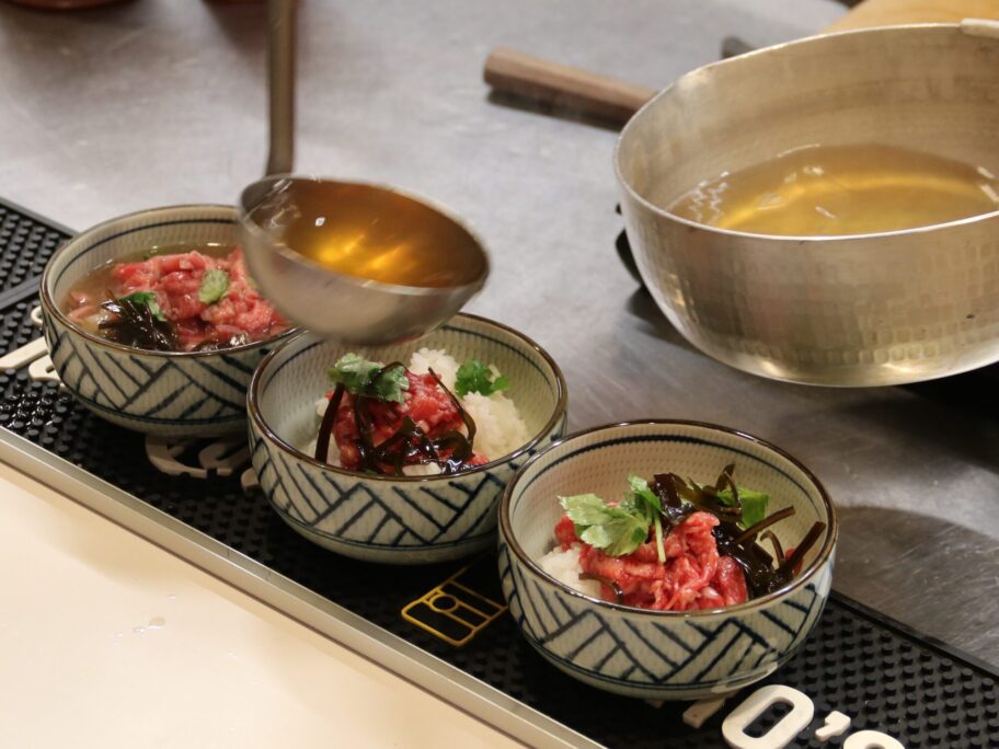 ▲ユッケの乗ったご飯に一番出汁を掛けます