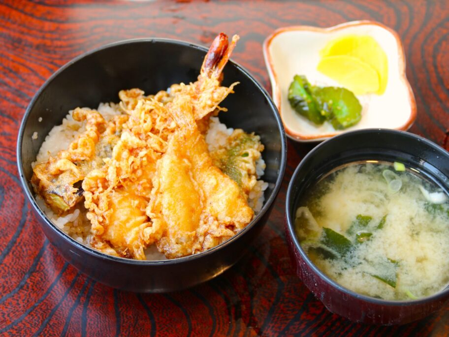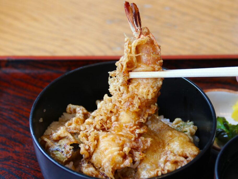 うどんを平らげたら天丼に。エビ、キス、ナス、ピーマンの4種入りです。