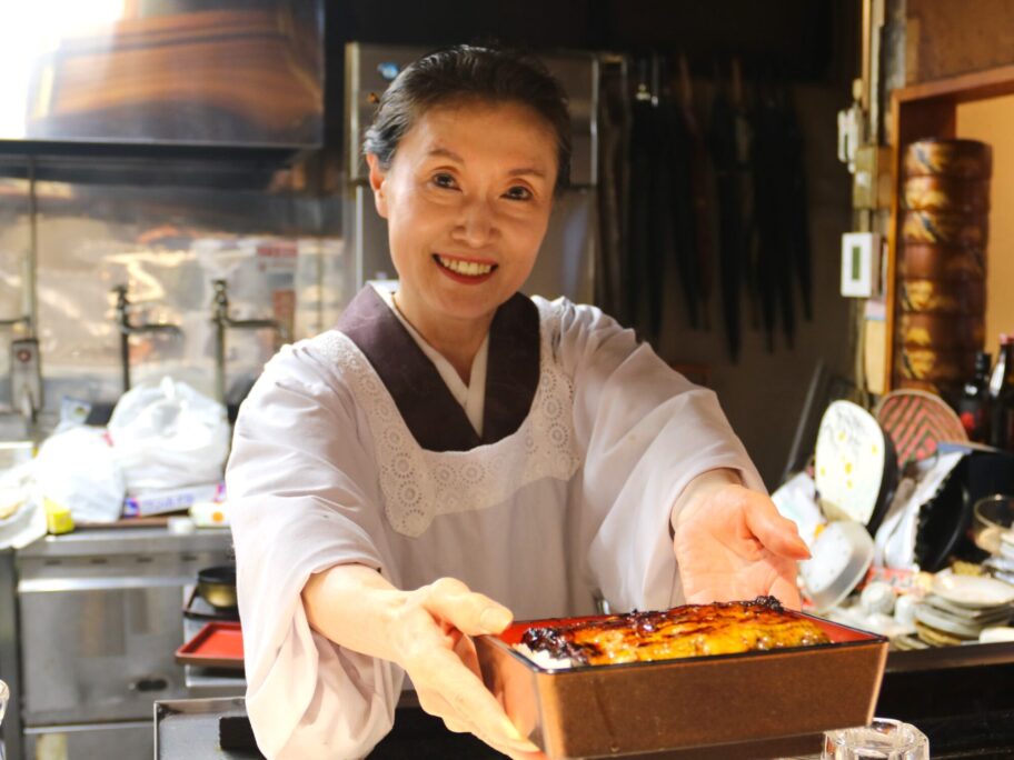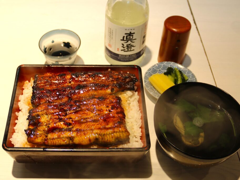鰻のフルコース、〆はもちろん蒲焼きです。鰻は時季によって産地を変えるそうで、ただいまは愛知県産。裂きと串差しを外注し、蒸しから焼きは女将さんが1人でこなします。