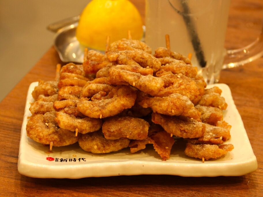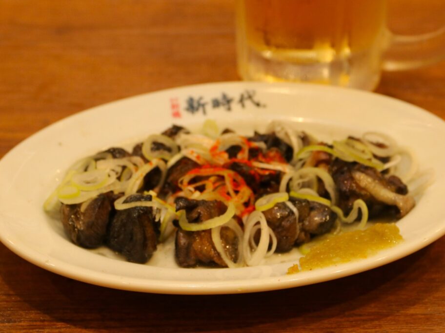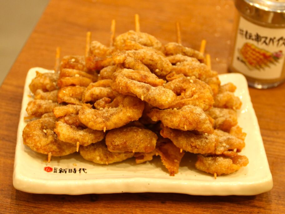鶏皮を串打ちして油で揚げ、甘辛のタレで味付けした伝串。余分な脂を落としてコラーゲンだけを残し、パリッとしてモチモチした「パリモチ」食感を味わえるとか。1本55円は激安ですね。