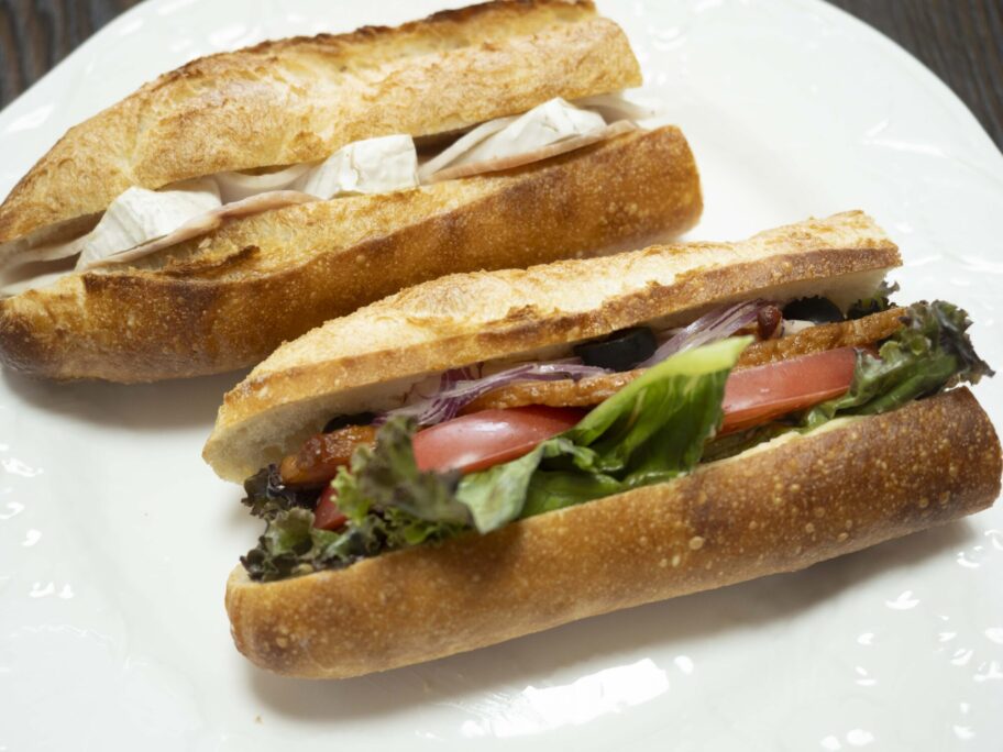 パンはすべて、群馬県産小麦を使い、ホシノ天然酵母で仕込んだバゲット。表面は香ばしく、中は引きが強め。でも一般的なフランスパンよりふんわり感があり、サンドイッチとして成立するやさしい食感だ。