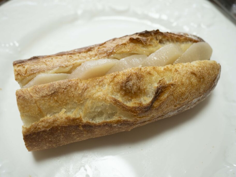 最後に、季節限定の「モモ」。まさかバゲットサンドで甘い系?と半信半疑だったが、これは衝撃だった。桃のコンポートは果実感たっぷりで、甘さ控えめのバタークリームと相性抜群。バゲットの塩気がちょうどよく、まるで上質なデザートプレートを手に持って食べているようだった。