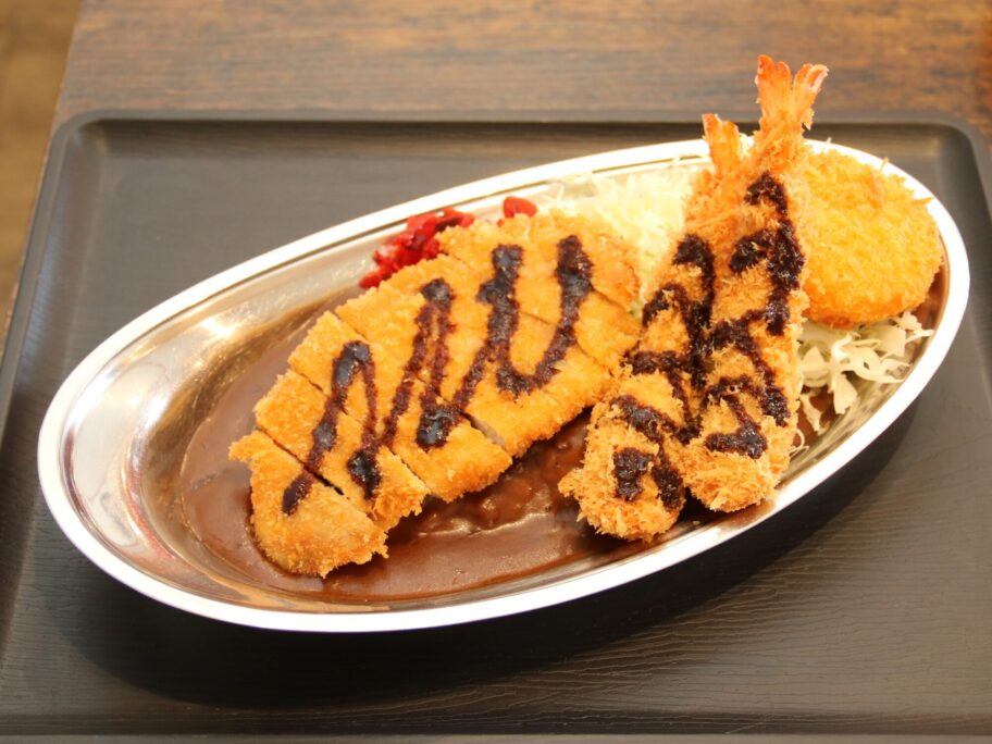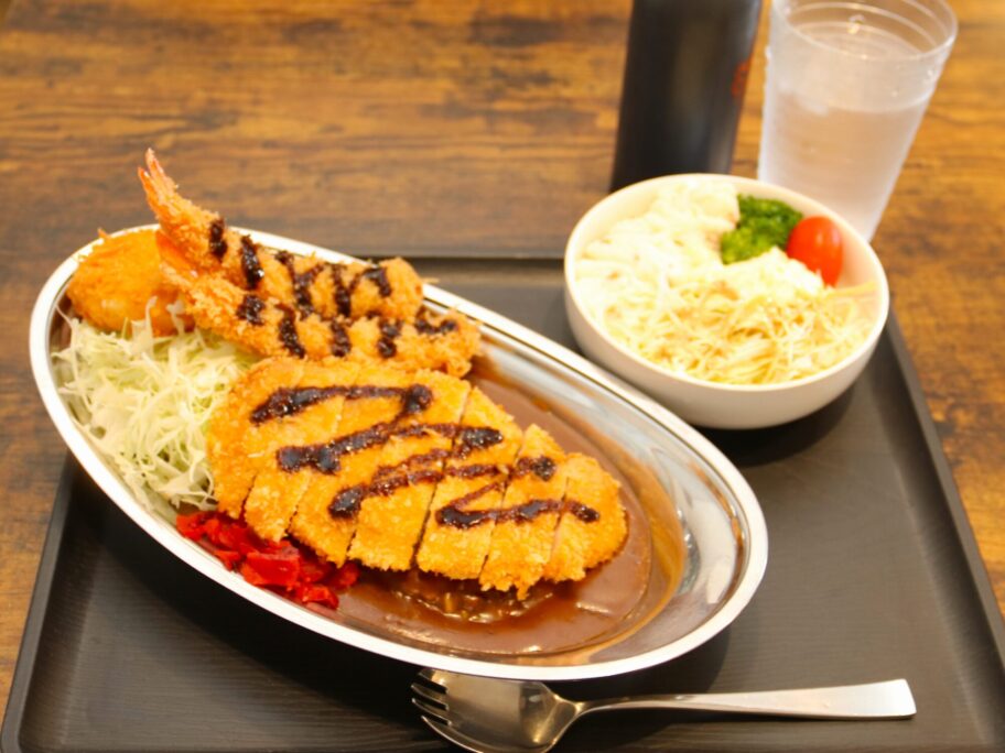 カツカレーが標準ですが、久しぶりなので豪勢にいきましょう。エビカツとカニクリームコロッケをトッピング。ポテトサラダも付けました。