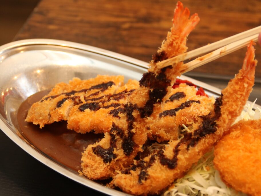 エビカツは期間限定。長さ12㌢くらいある堂々としたエビです。カリッとした食感。フライでなくカツであることを実感できます。
