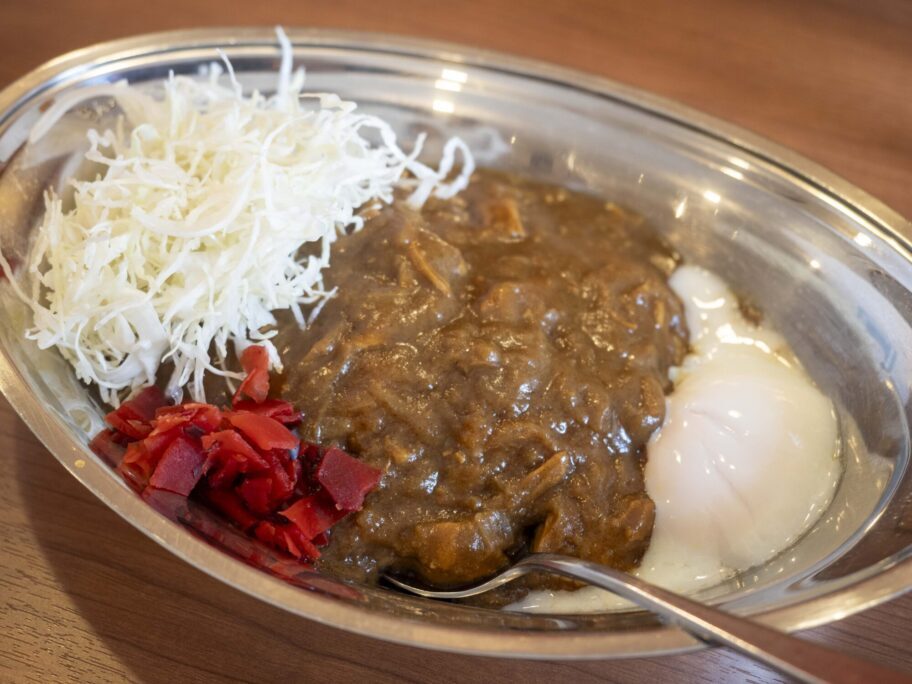 焦げ茶色のどろっとしたルーは一見、辛そう。でも、どちらかというかまろやか。素朴な中に深い旨みを感じます。優しく懐かしい味わいです。