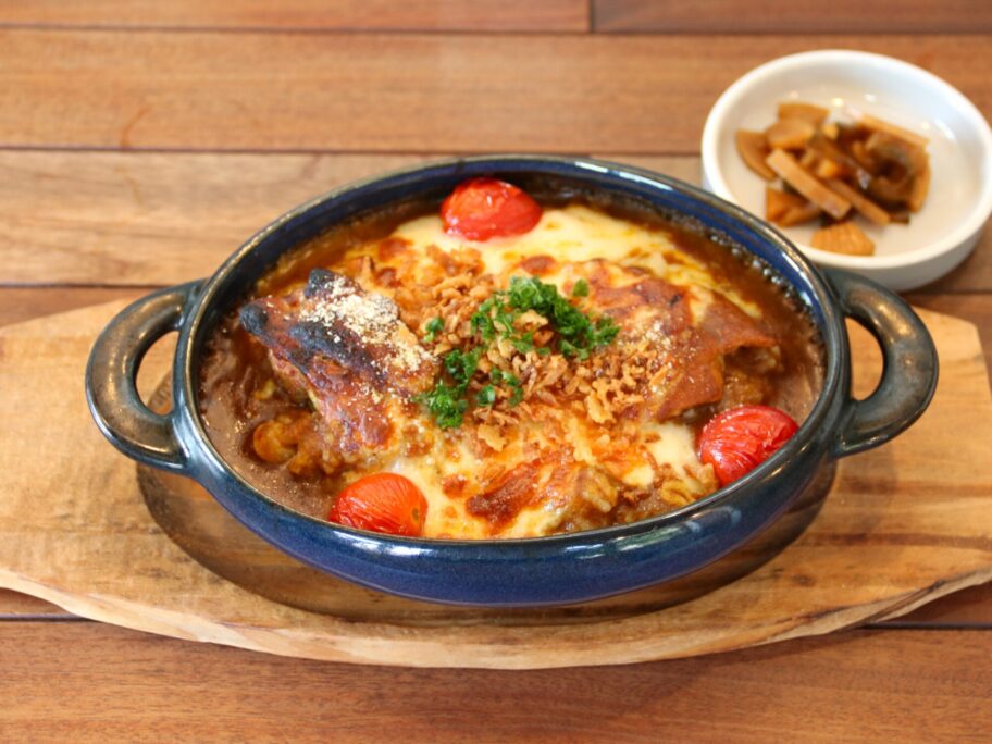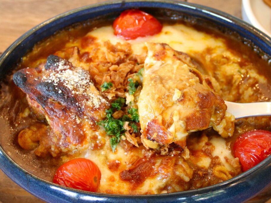カレーを一口。焼き上げたことでベースのチキンカレーより辛く感じます。これをマイルドにしてくれるのがチーズ。十数種類ものスパイスの織りなす香りに果物のフルーティーな甘みも加わり、スプーン一杯の中に奥深い味わいが詰まっています。