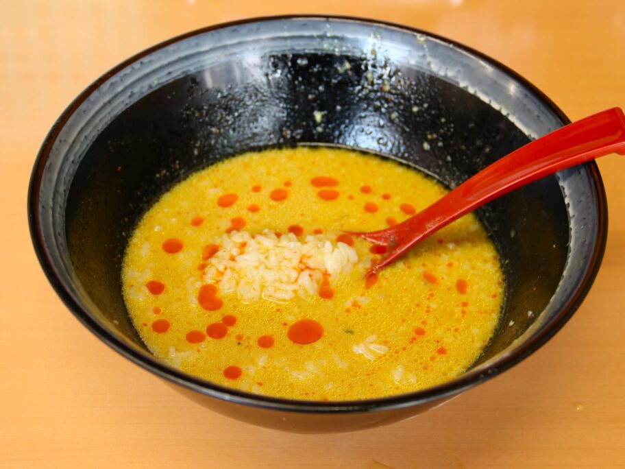 麺も具もきれいに平らげたら、残ったスープにご飯を投入します。よく混ぜればスープカレーの出来上がり。辛さに慣れたところで、ラー油をたっぷり掛け回していただきましょう。これでまさしくレッド。完食、完飲して冷たい水をグイッと。爽快な気分になりました。