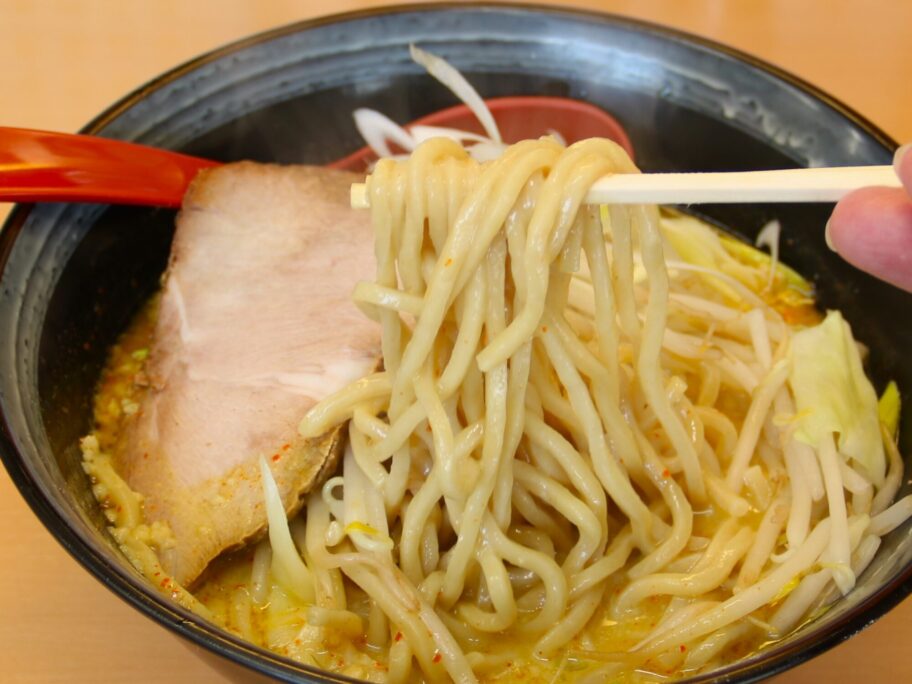 小麦胚芽入りの自家製麺はやや縮れ入り。二郎系のわしわし感とともに、もちもち感もあります。醤油や味噌もいいけど、カレーに最高に合いますよ。