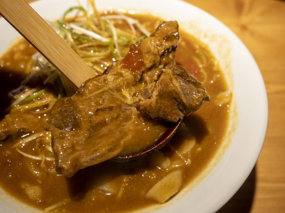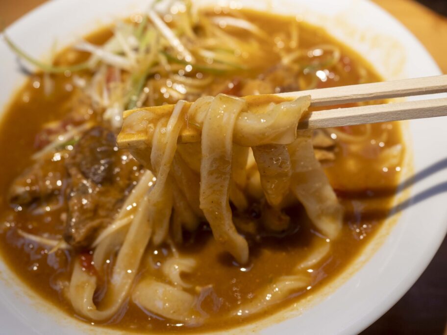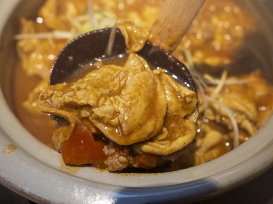 慣れてくると、辛さの中に奥深い旨みを感じます。よく見ると、細かいトマトと豚挽き肉がありました。いろいろな野菜が溶け込んでいるようです。