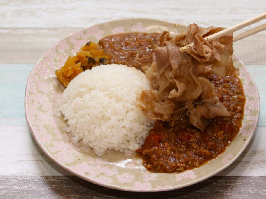 カレーも頼んでみました。こちらは「のせ肉」。しゃぶしゃぶ用の豚肉をソース、醤油、出汁でさっと煮ています。カレーと合わせて挽き肉との二重奏を味わいます。さすが、「とんちゃん」。