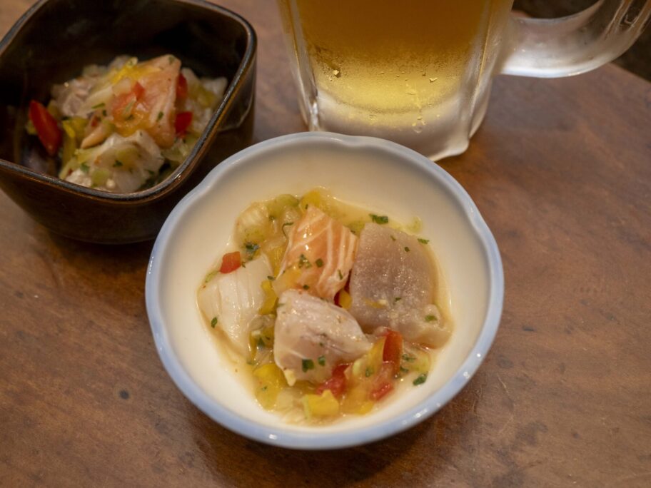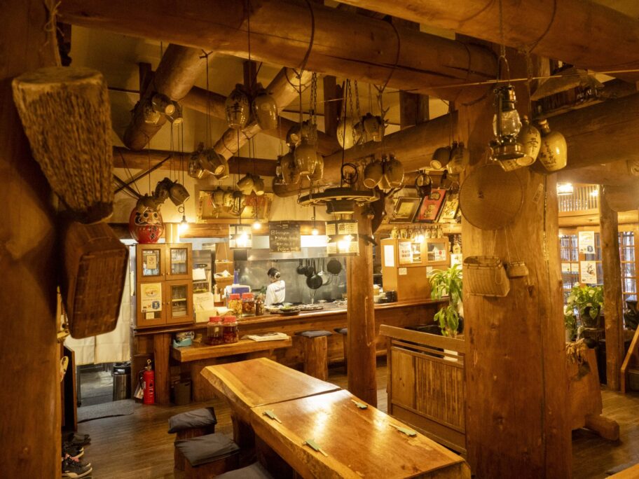 店内は山小屋風で木のぬくもりに包まれています。テーブルも椅子も丸太を加工したもの。案内された掘りごたつ式の席は、桜の古木を使った長さ7㍍ほどの一枚板で、なんとも贅沢。腰を下ろすと、お通しは刺身のマリネ風。丁寧な仕事が光り、最初のひと口から期待がふくらみます。