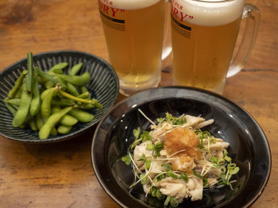 「ちょい飲みセット」を注文しました。ドリンク2杯と日替わりつまみ2品で1500円。この日のつまみは、枝付きの大粒枝豆とヤゲンナンコツのおろしポン酢。ナンコツは茹でてあってポリポリ。大根おろしとポン酢のさっぱり感で、箸が止まりません。