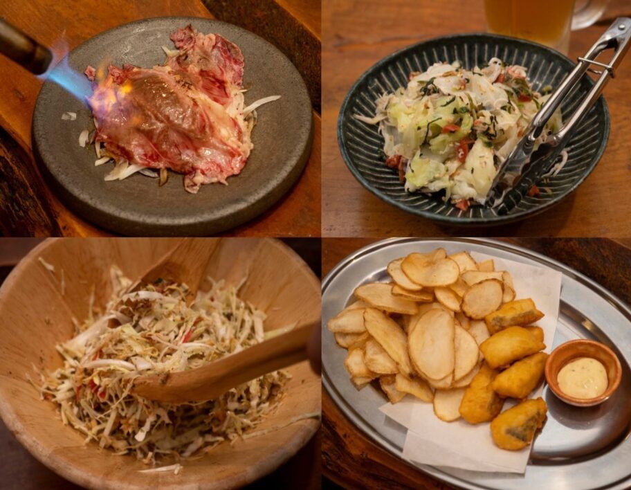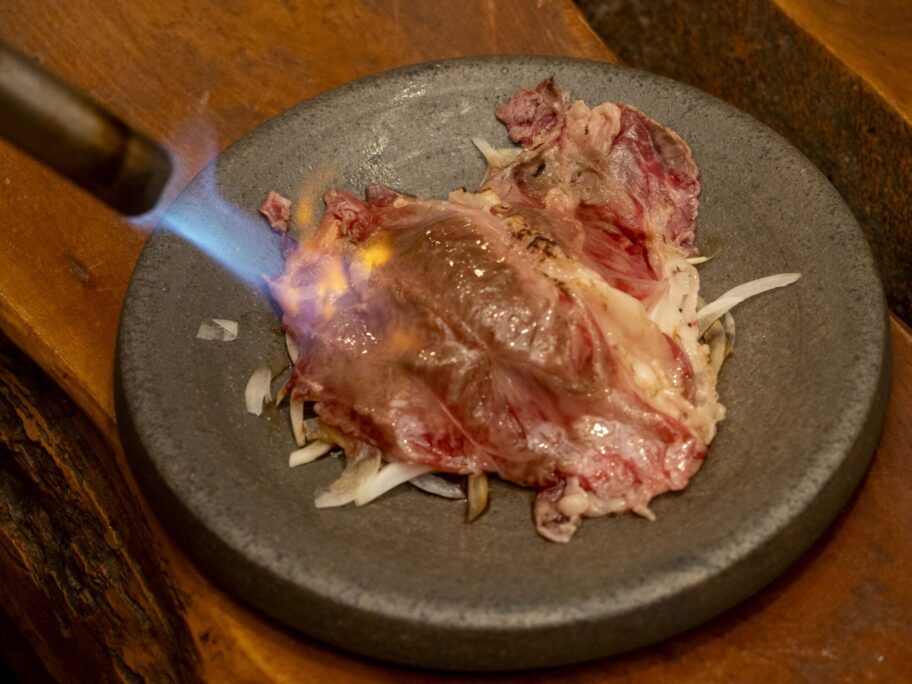驚いたのは「国産牛あぶりのすき焼き風」。玉ねぎの上に牛肉をのせ、バーナーで炙って仕上げます。香ばしい匂いに包まれる瞬間は格別で、思わず目を閉じました。