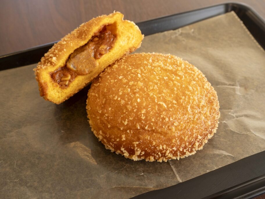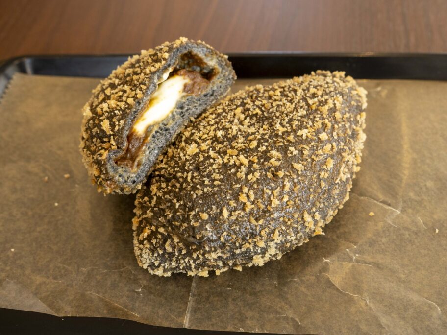 次は黒。見た瞬間に思わず「おっ」と声が出る。竹炭を練り込んだ生地は、パンというより漆黒のオブジェ。かじればサクサク。赤と同じく米粉仕立ての衣が軽快だ。 中からあふれるのは、スパイスの効いた大人味のカレー。その中心に待っているのは、とろけるチーズ。しかもモッツァレラにゴーダ、さらに別の種類を合わせた本格派。スパイスとチーズが溶け合い、奥行きのあるコクが生まれる。これが5年連続金賞。納得どころか、ちょっと感動すら覚える。