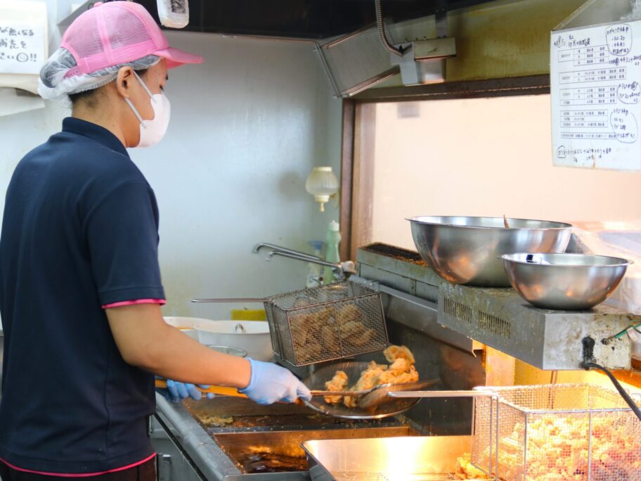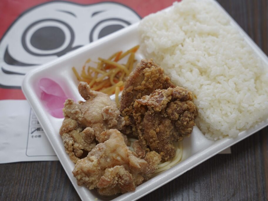 昼前から続々とお客さんがやってきます。弁当の注文が多いですね。「日本一ご飯が進む唐揚げ」がコンセプト。ご飯は150㌘の小盛りから400㌘の特盛りまで同一料金となっています。
