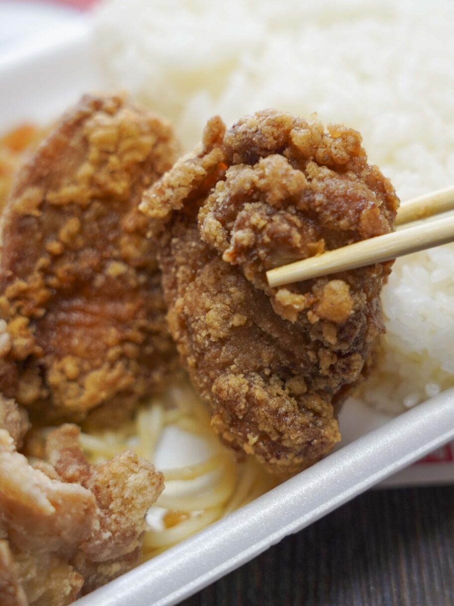 醤油は特製ダレに1晩漬け込み、注文を受けてから衣を付けて揚げます。ニンニクが効いて、やや濃いめの味付け。唐揚げの二郎系と言った感じのインパクトがあり、確かに白飯が進みそう。